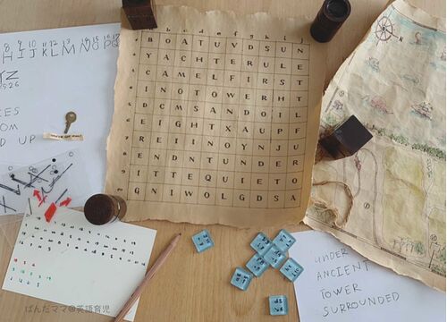 前回「宝探しゲームをやってみた!その1」の続きです。 www.pandamama-eigoikuji.xyz 宝箱を見事探し当てた長男と次男。 やったー! と興奮したまま、お風呂場で宝箱を開けようとしたので、慌てて止めました。 せめてバスタブから出そうね( ̄◇ ̄; 部屋に誘…